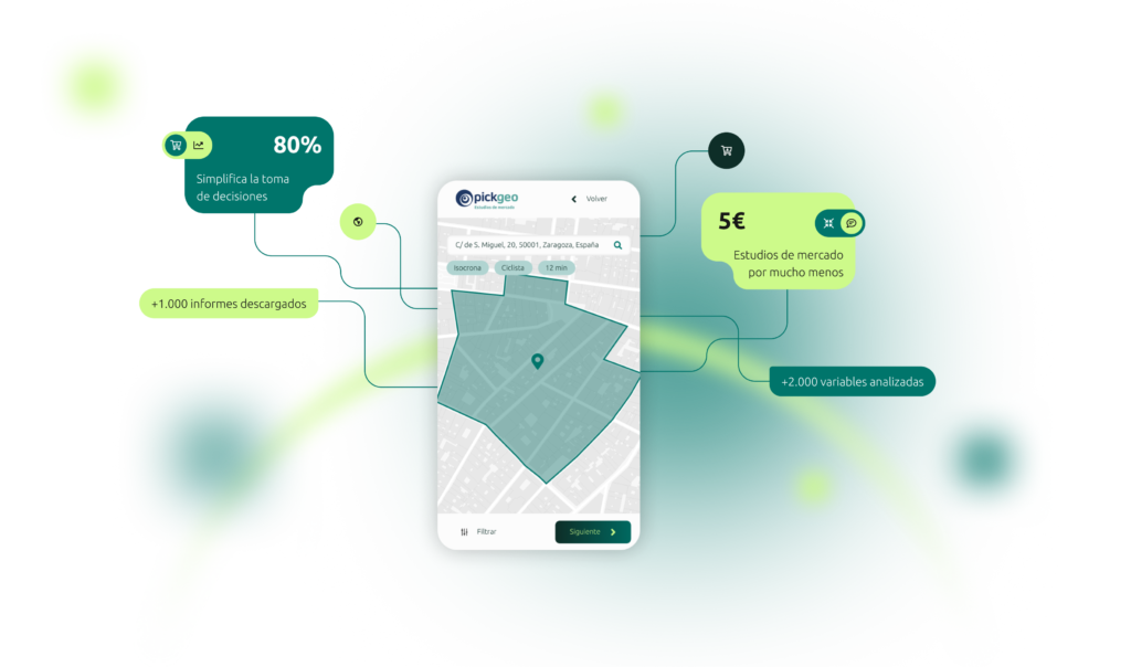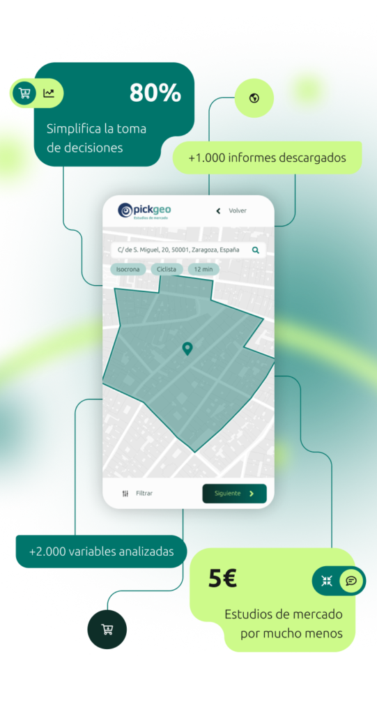 Con Pickgeo podrás seleccionar el punto en el mapa que te interese, y definir las características que desees analizar. ¿Un radio especifico? ¿Un trayecto determinado? Tú decides.